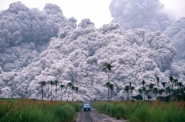 Водитель пикапа пытается сбежать от облака пепла, во время извержения вулкана Пинатубо на Филиппинах, 17 июня 1991 года.источник