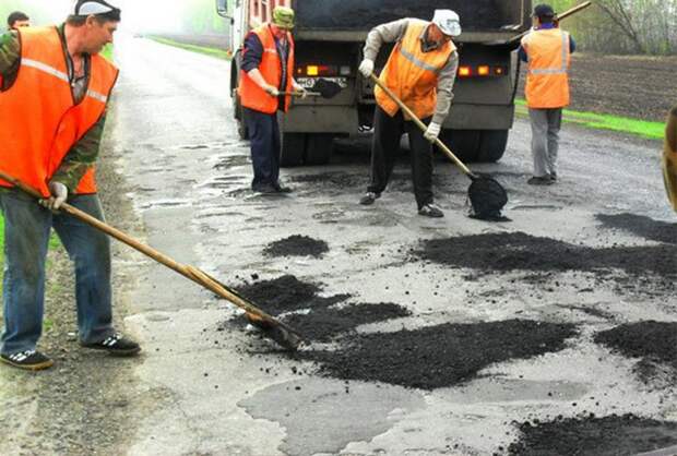 6) Ямочный ремонт если имеет место быть — допускается исключительно как временная и вынужденная мера. Выгрызание ямок и заделка их асфальтом должны быть сделаны за ОДИН день. При этом стенки и дно ямки в старом асфальте разогревают специальной горелкой, чтобы новый асфальт лучше прилип к старому. Через несколько недель участок дороги с заплатками полностью ремонтируют, сдирая асфальт до щебенки и укладывая новый. Стыки старого и нового участка прогревают специальной горелкой до пластичного состояния, чтобы не было заметно границы.