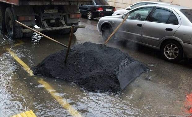 P.S. Асфальт делается из нефти, песка и щебня. Мы ведь нефтяная держава! У нас дохрена нефти и щебня!!! источник